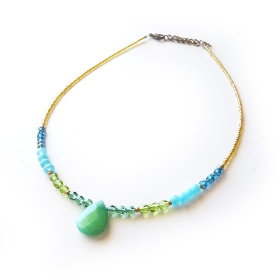 Lovely necklace created with an agate teardrop in soft green color, swarovski crystals and several glass beads. Perfect for a colorful summer look ;)