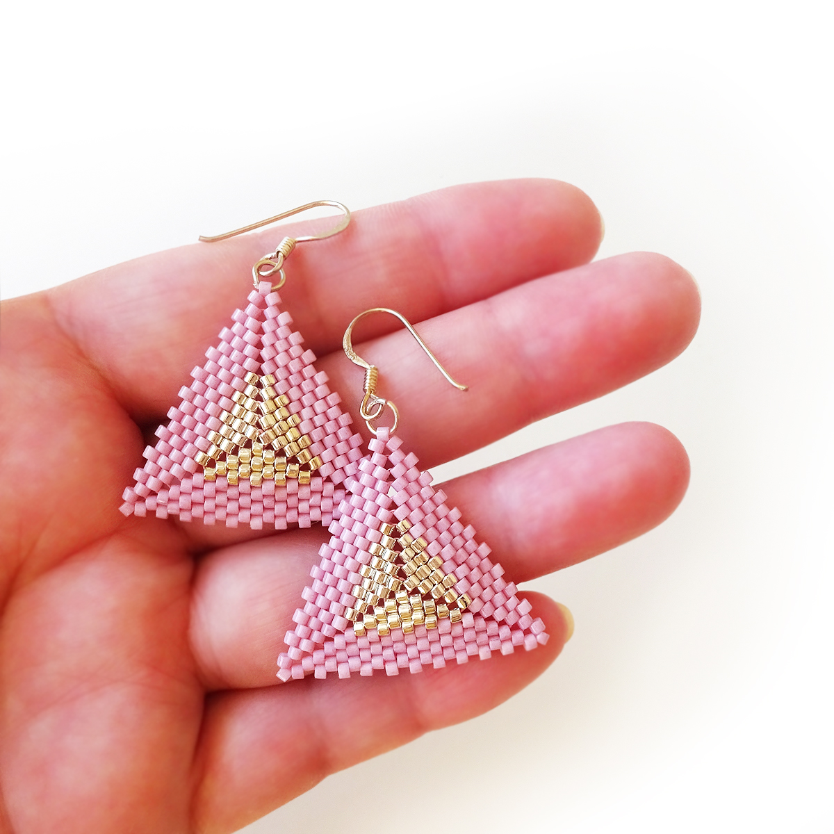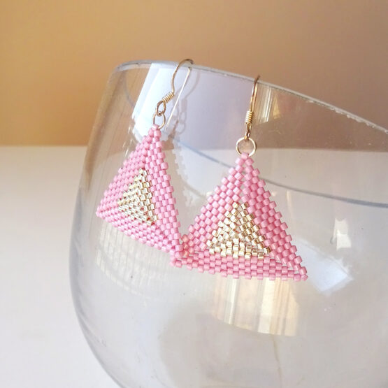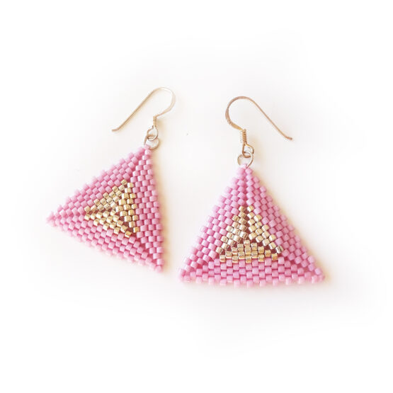 Beautiful pyramid earrings created with vintage pink beads with a triangle core of Sterling silver dipped beads, all set in sterling silver earrings.