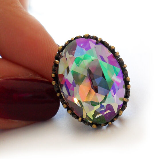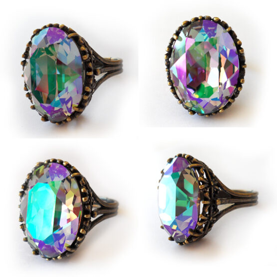 Shine everyday with this big oval ring created with a gorgeous swarovski crystal rhinestone in the new paradise color that sparkles in purple , pink , blue and green lights with a grey stone , all set in a bronze adjustable ring base.