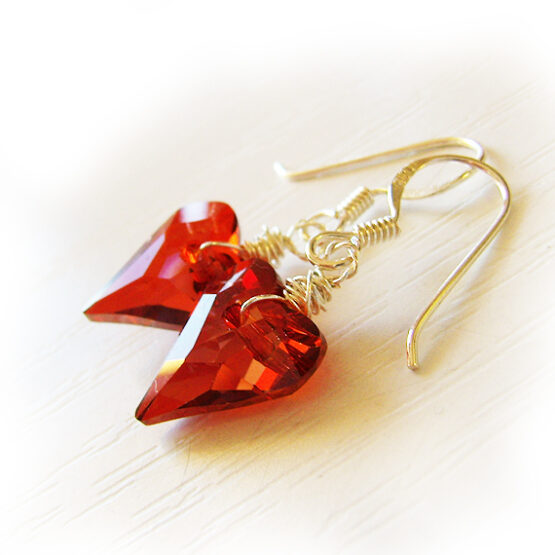 Sexy heart faceted earrings created with gorgeous shimmering swarovski crystals in a red ruby color , wrapped in sterling silver wire and set in sterling silver hoops.