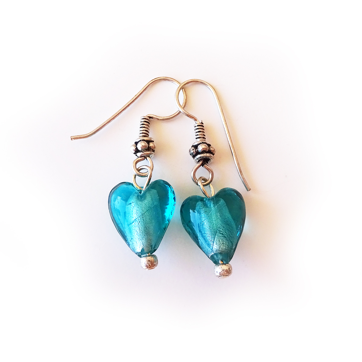 Teal Heart Earrings created with shiny glass hearts, all set in silver plated hoops.