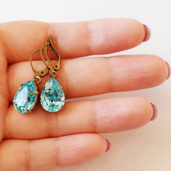 Teardrop rhinestone faceted earrings created with gorgeous shimmering swarovski crystals in a New light Turquoise color , set in bronze leverback earwires.