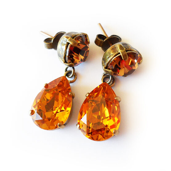Shine everyday with this new Teardrop Earrings ! A lovely rhinestone faceted earrings created with gorgeous shimmering swarovski crystals in a sparkly topaz drops and light brown rhinestones , all set in bronze studs earrings.