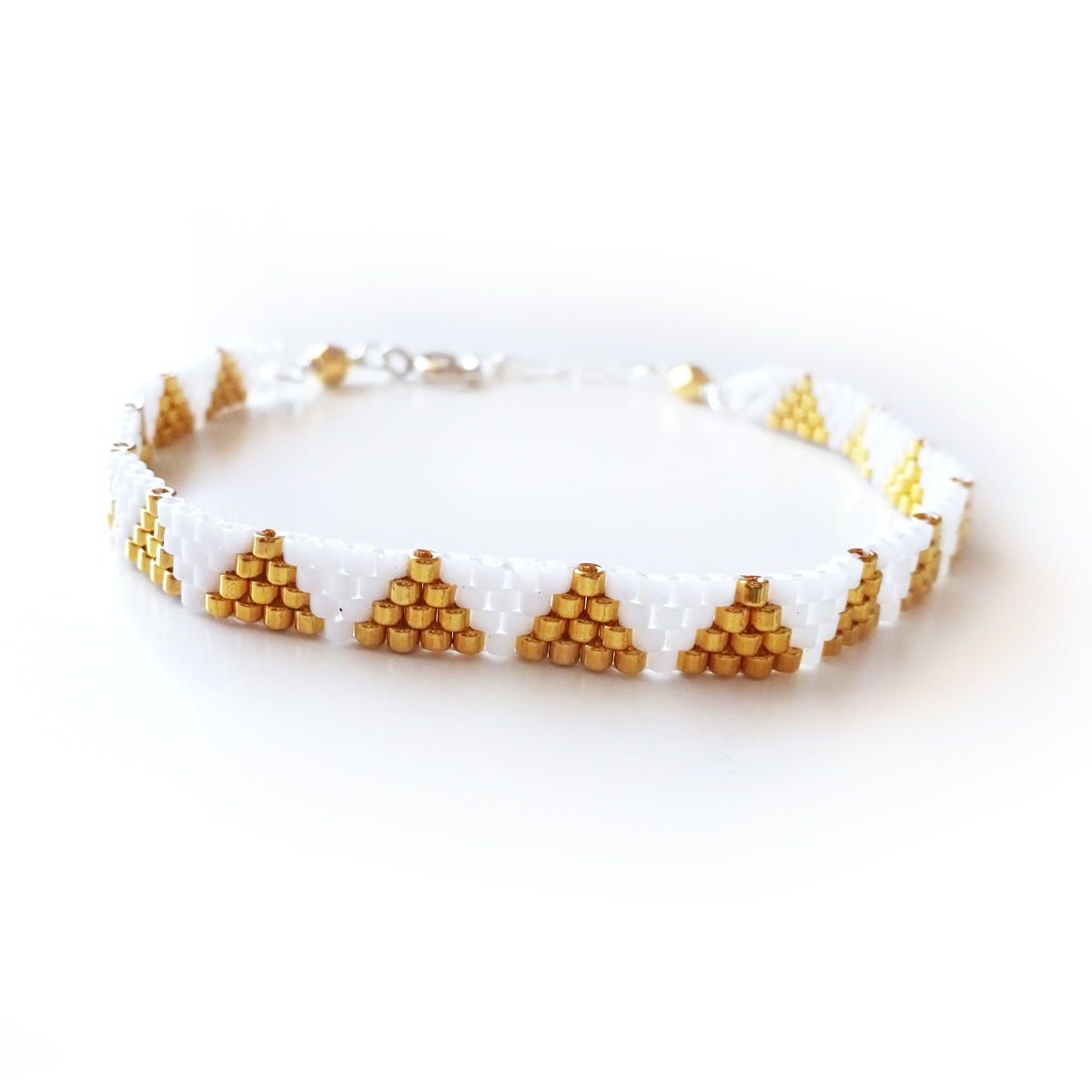 Lovely pyramids inspired bracelet created with miyuki glass beads dipped in 24kt gold and white beads , all set in sterling silver clasp