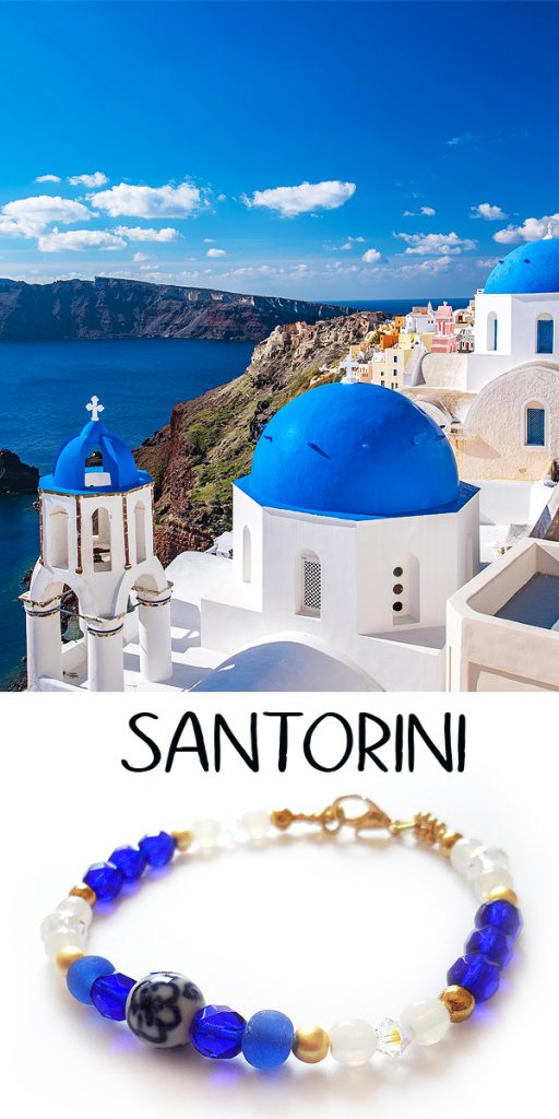 The beauty of Santorini in Greece is everywhere from the amazing architecture to the magical beaches and unique history! A perfect place to dream and relax that ispired me to create a bracelet with white and blue beads to celebrate it!