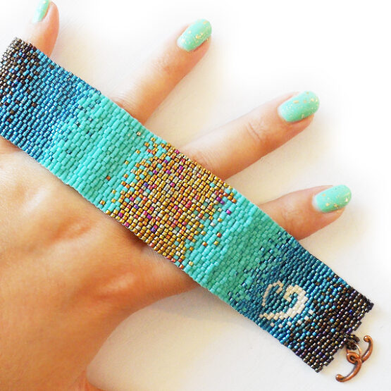 Elegante y original brazalete en degradado creado a mano con mas de 2000 bolitas de cristal de la mejor calidad en varios colores cobre , azules y dorados con un hermoso diseño único de dicopebisuteria y unas 8 horas de trabajo ! Esta preciosa joya para toda la vida se sujeta con un cierre de cobre muy fácil de usar !