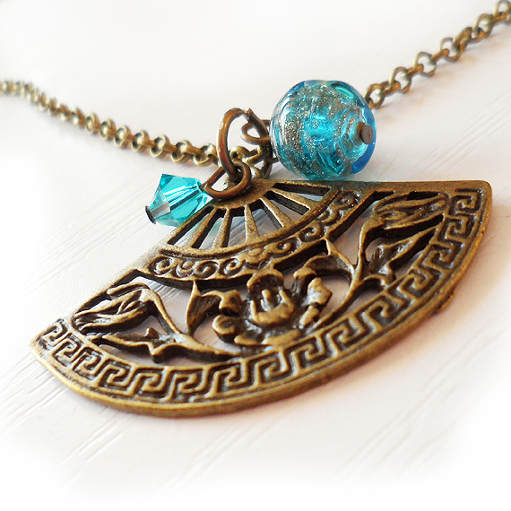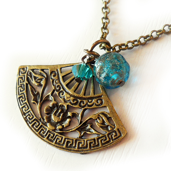 Hermoso y elegante colgante de abanico creado con un precioso charm en bronce , una bolita de cristal de murano azul y un abalorio de cristal de swarovski en tono azul-verde .