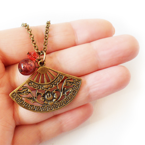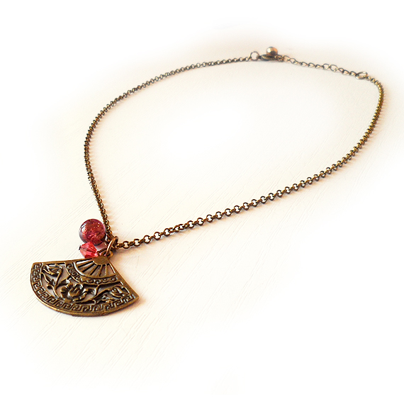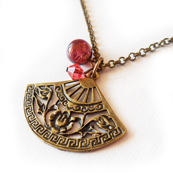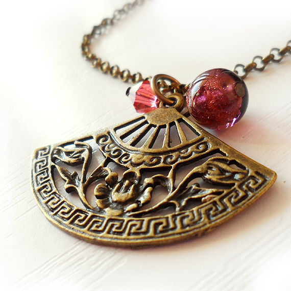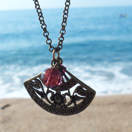 Hermoso y elegante colgante de abanico creado con un precioso charm en bronce , una bolita de cristal de murano lila y un abalorio de cristal de swarovski en tono rosa .