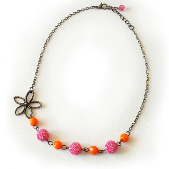 Celebra el Verano con este colorido collar creado con bolas facetadas de cristal de bohemia en color naranja y tres de mis cuentas creadas con bolitas forrando bolas de madera ! Un collar único de edición super limitada para que luzcas tus mejores looks !