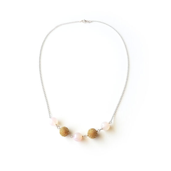 Precioso collar Daphne creado con bolitas de semipreciosas de agata en rosa muy clarito y bolitas hechas a mano con abalorios de cristal dorados, todo montado en plata de ley!