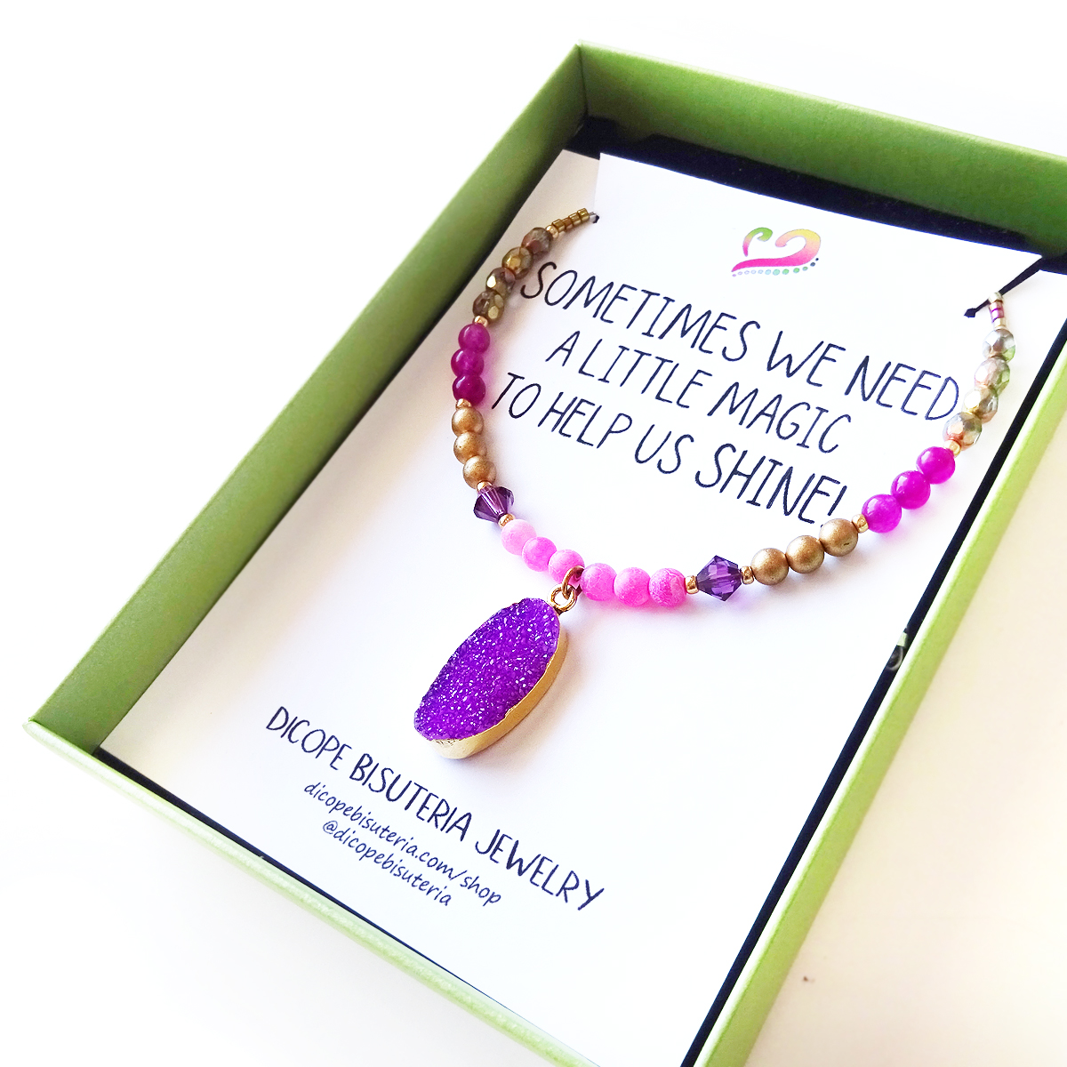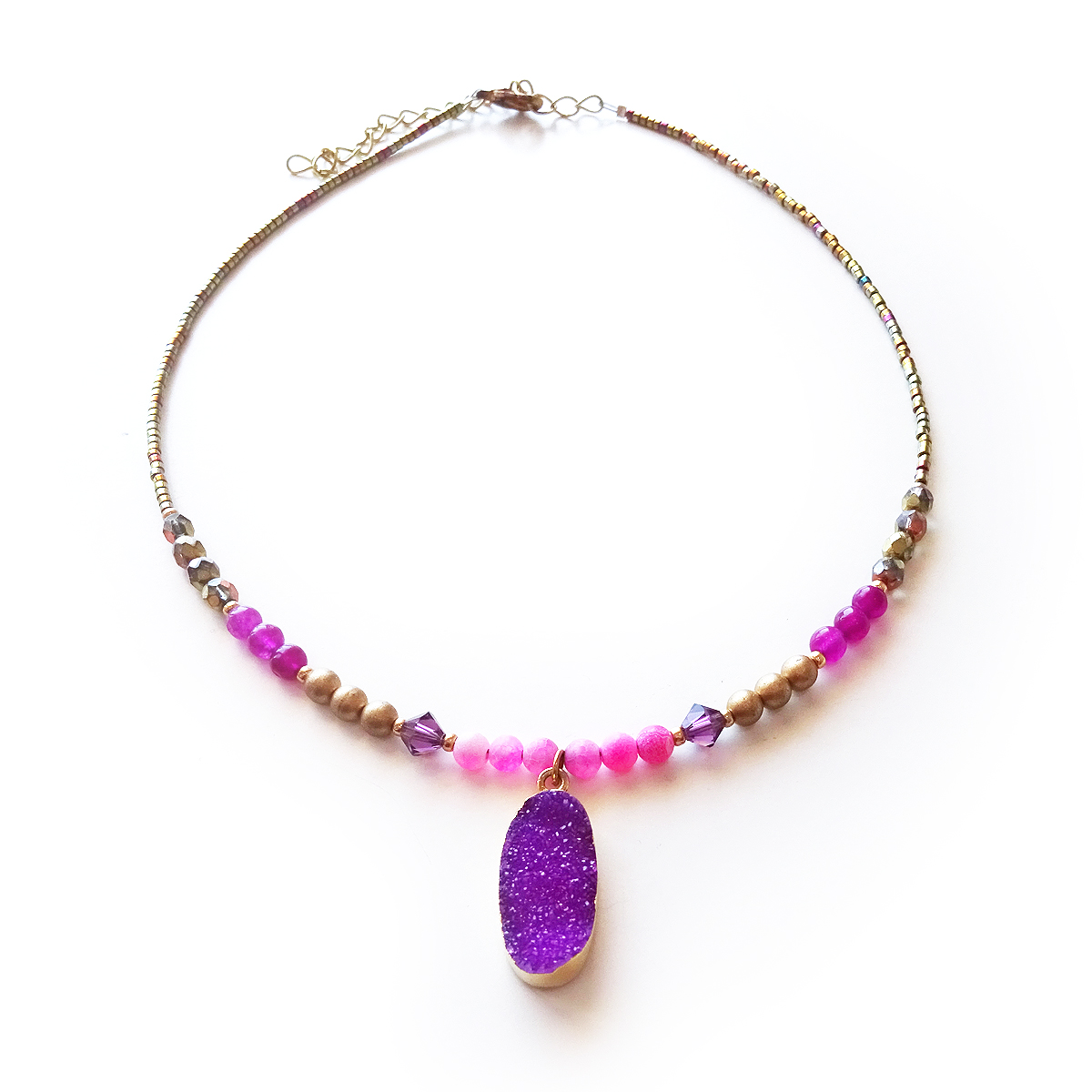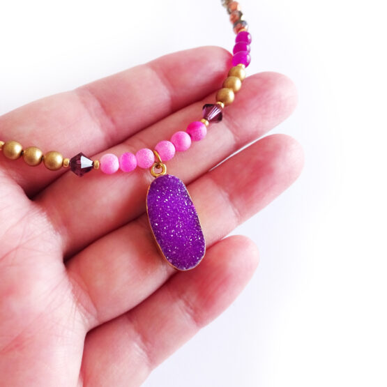 Precioso collar con una maravillosa drusa de piedra semipreciosa de ágata en color morado amatista! Montada con cuentas de gemas semipreciosas de agata , swarovski y cristalitos varios ! Solo tengo tres de estas increíbles drusas así que no te quedes sin tu collar! Perfecto para dar un toque mágico a tu ropa favorita!