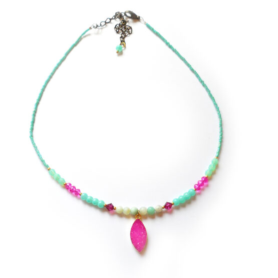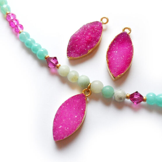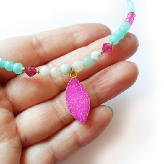 Precioso collar con una maravillosa drusa de piedra semipreciosa de ágata en color rosa placada en oro ! Montada en un con cuentas de gemas semipreciosas de aguamarina , swarovski y cristalitos varios ! Solo tengo tres de estas increíbles drusas así que no te quedes sin tu collar! Perfecto para dar un toque mágico a tu ropa favorita!