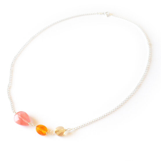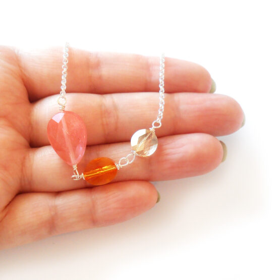 Disfruta de cada momento con este elegante y femenino collar Emma creado con óvalos de cristales de swarovski en narana y dorado y una gota de piedra semipreciosa de cuarzo cerezo facetada, todo montado en plata de ley! Este collar es una versión con cuentas y cadena mas grandes que mis otros collares de plata de ley que destaca mas, sin ser demasiado grande!