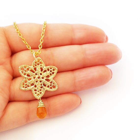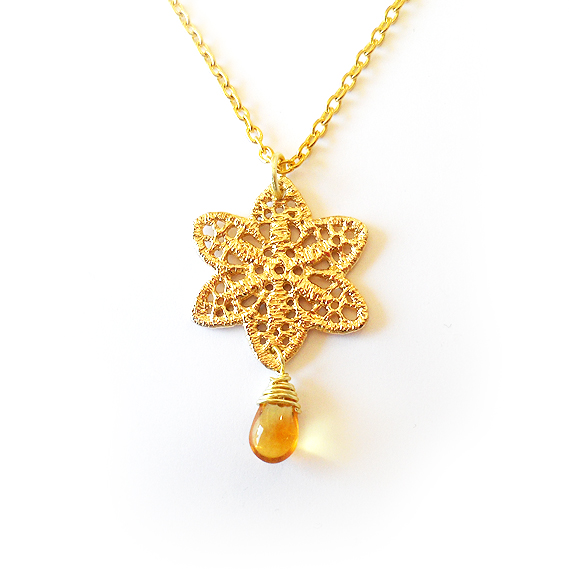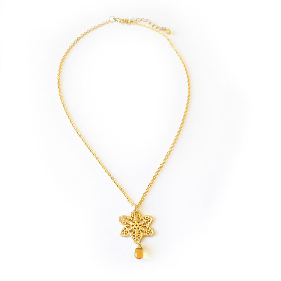 Elegante y Original collar Shyla imitando a una delicada flor creada con ganchillo dorada y una preciosa gotita de color topacio! Aunque de aspecto delicado esta flor esta creada en con un charm metal rígido y fuerte! Ideal para crear un look romántico y combinar con tu ropa favorita!