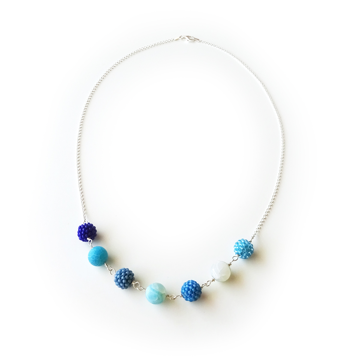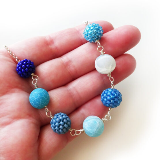 Maravilloso collar Freya creado con bolitas de semipreciosas de agata mate en tonos azulados y bolitas hechas a mano con abalorios de cristal, todo montado en plata de ley!