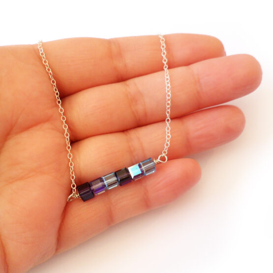 Elegante y Original collar Irina creado con seis cubos de cristal de swarovski en tonos lilas y azules , todo montado en plata de ley! Ideal para crear un look minimalista y romántico! Siente los destellos de estos cristalitos resplandeciendo y alegrando tu día!