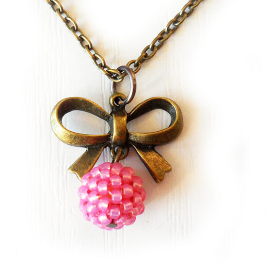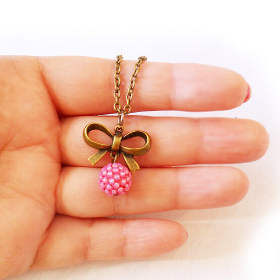 Hermoso y elegante este collar de lazo con bolita rosa esta creado con abalorios de cristal rodeando una bolita de madera !Perfecto para dar un toque romántico a tus looks !