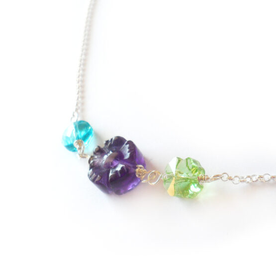 Disfruta de cada momento con este elegante y femenino collar Lucia creado con óvalos de cristales de swarovski en verde y azul y una flor de piedra semipreciosa de amatista, todo montado en plata de ley! Este collar es una versión con cuentas y cadena mas grandes que mis otros collares de plata de ley que destaca mas, sin ser demasiado grande!
