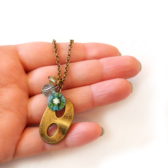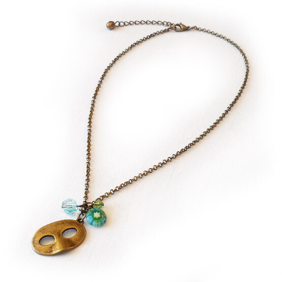 Original collar antifaz de teatro creado un charm en bronze y abalorios de cristal , Millefiori y un cristal de swarovski en colores verdes y azules ! Perfecto para llevar con tus looks de cada día!