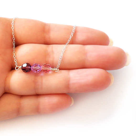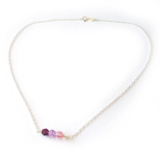 Minimalista y elegante collar Miranda creado con tres cristales de swarovski en tonos lila y rosa , todo montado en plata de ley! Perfecto para dar un toque de color a tus looks de trabajo!