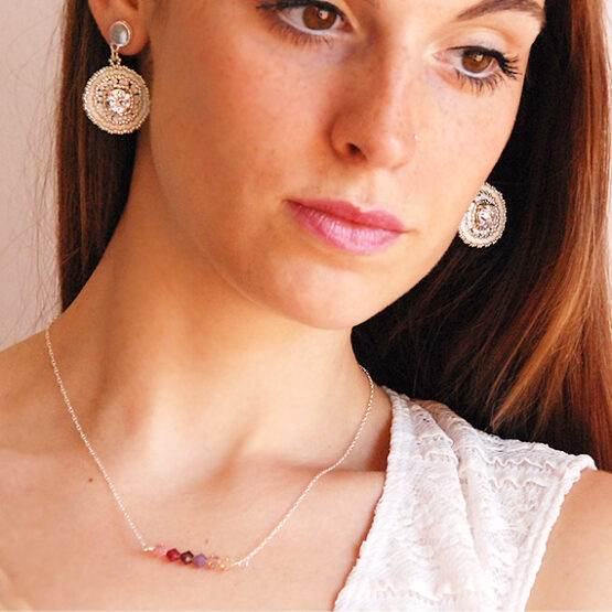 Sencillo y elegante collar Paula creado con cuentas de cristales de swarovski en tonos verdes, todo montado en plata de ley. Perfecto para dar un toque elegante a tus vestidos y blusas favoritas!