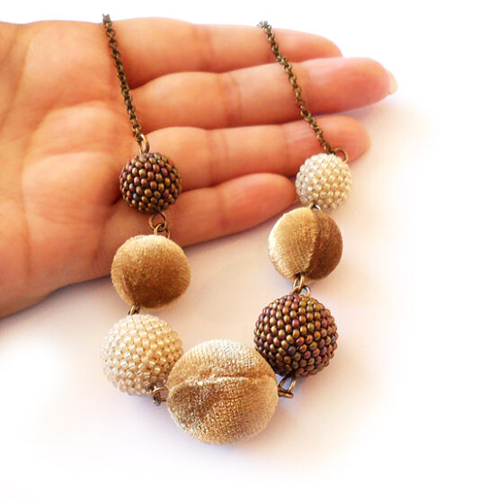 Elegante y Original collar creado con bolas de terciopelo en tonos dorados y bolas hechas a mano con abalorios de cristal rodeando unas cuentas de madera! Perfecto para dar un toque de luz a tus looks!