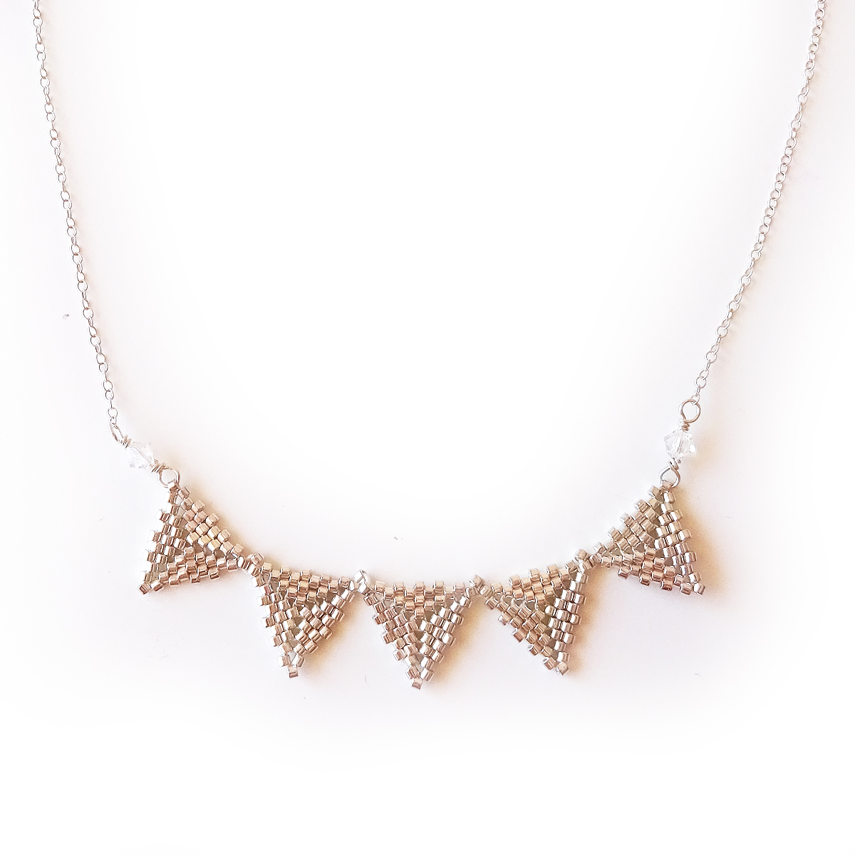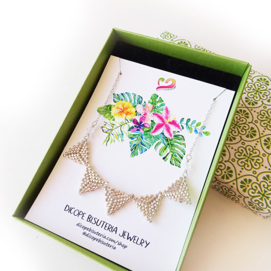 Maravilloso Collar Verbena creado con bolitas de cristal bañadas en plata de ley y cosidas para crear esta forma de banderillas y montadas en plata de ley