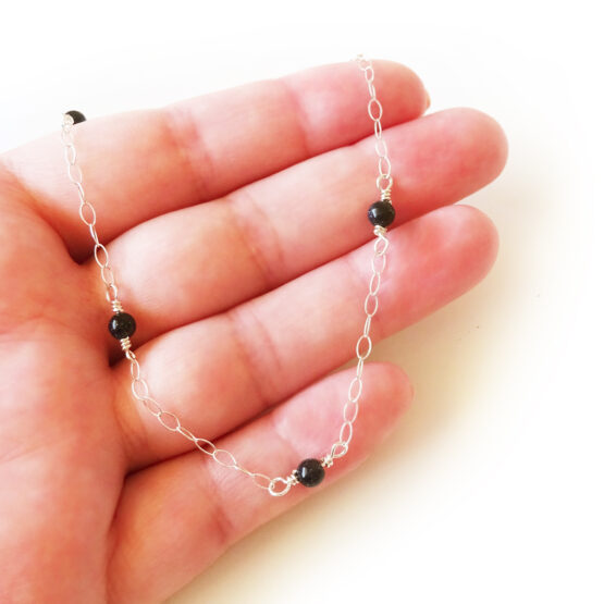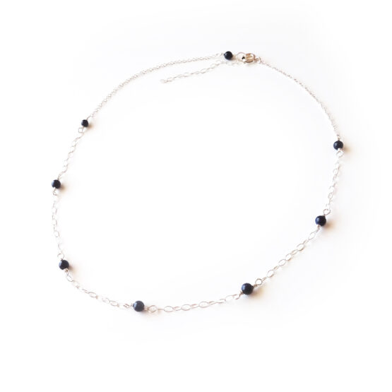 Preciosa gargantilla creada con una cadenita de plata de ley y cuentas de cristal sol azul. Esta es una de mis piedras favoritas por ese brillito tan mágico que tienen ♥