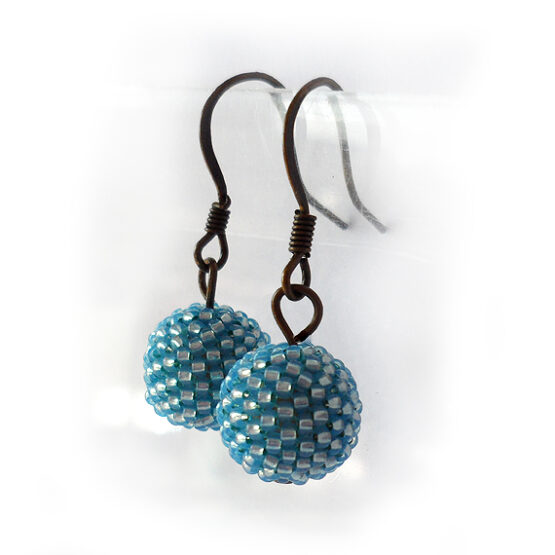 Te encantaran estos elegantes y originales pendientes creados con abalorios de cristal azul brillante forrando bolitas de madera y montados en pendientes de bronce . Ideales para llevar todos los días con tu ropa favorita!