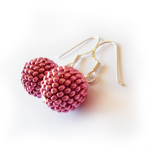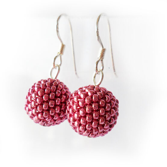 Casuales y originales pendientes creados con abalorios de cristal en un precioso color rosa metálico forrando cuentas de madera y montados en pendientes de plata de ley .
