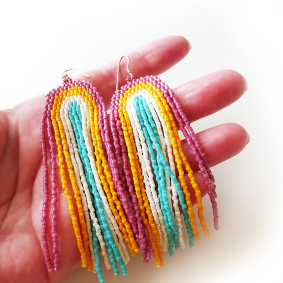 Maravillosos pendientes con forma de Arcoiris creados con bolitas de miyuki de cristal en varios colores rosas , naranjas y azules. Montados en plata de ley