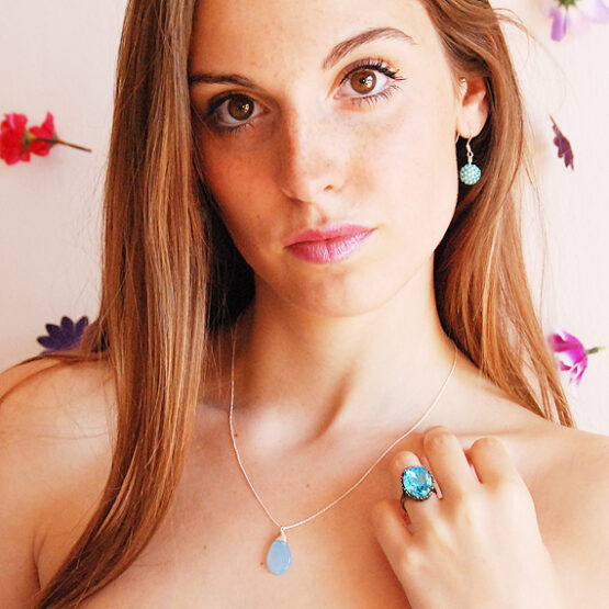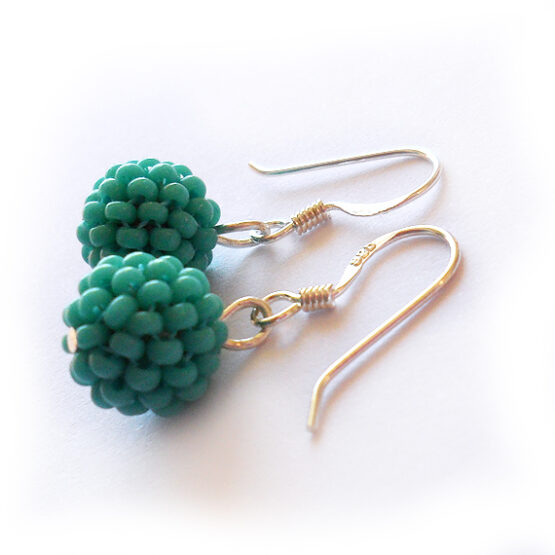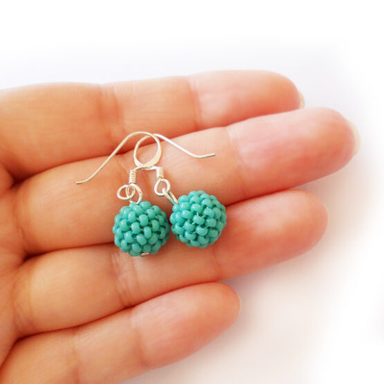 Te encantaran estos elegantes y originales pendientes creados con abalorios de cristal azul turquesa forrando bolitas de madera y montados en pendientes de plata de ley .