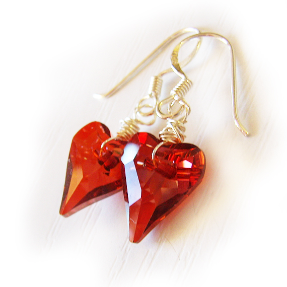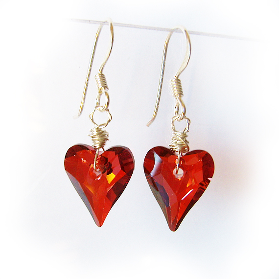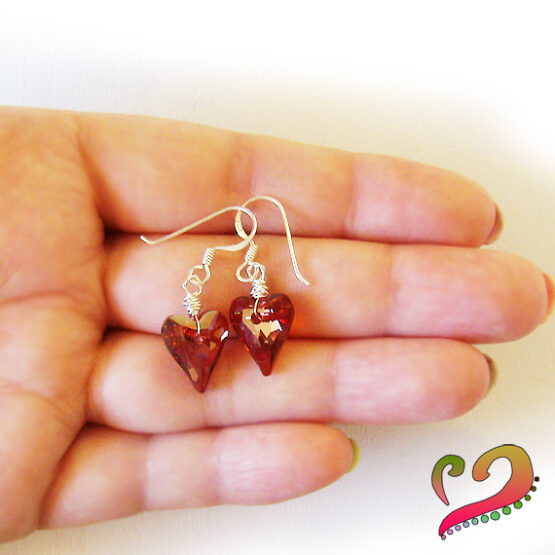 Preciosos pendientes corazón creados con cristales de Swarovski en tono rojo y montados en pendientes de plata de ley .
