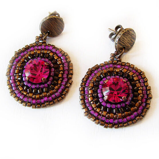 Preciosos pendientes creados a mano con bolitas de cristal en tonos amatista y bronce con strass de swarovski en color rosa – fucsia intenso .