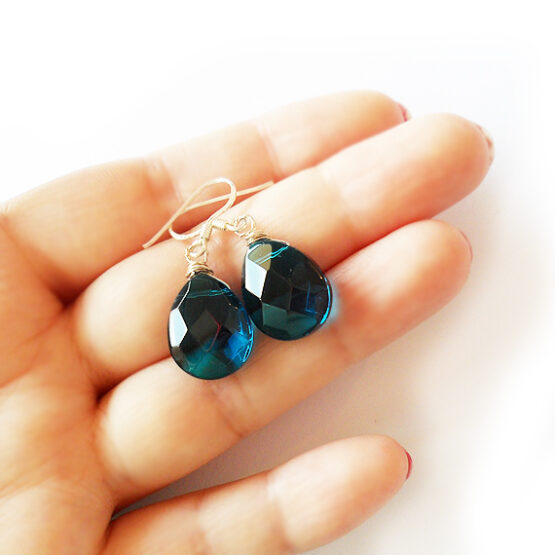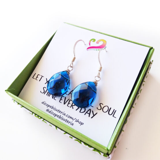 Elegantes pendientes creados con gotas facetadas de cristal en tono azul oscuro y montados en pendientes de plata de ley . Me fascina este color azul tan intenso como el azul del mar! Ideales para para lucir con tus vestidos favoritos!