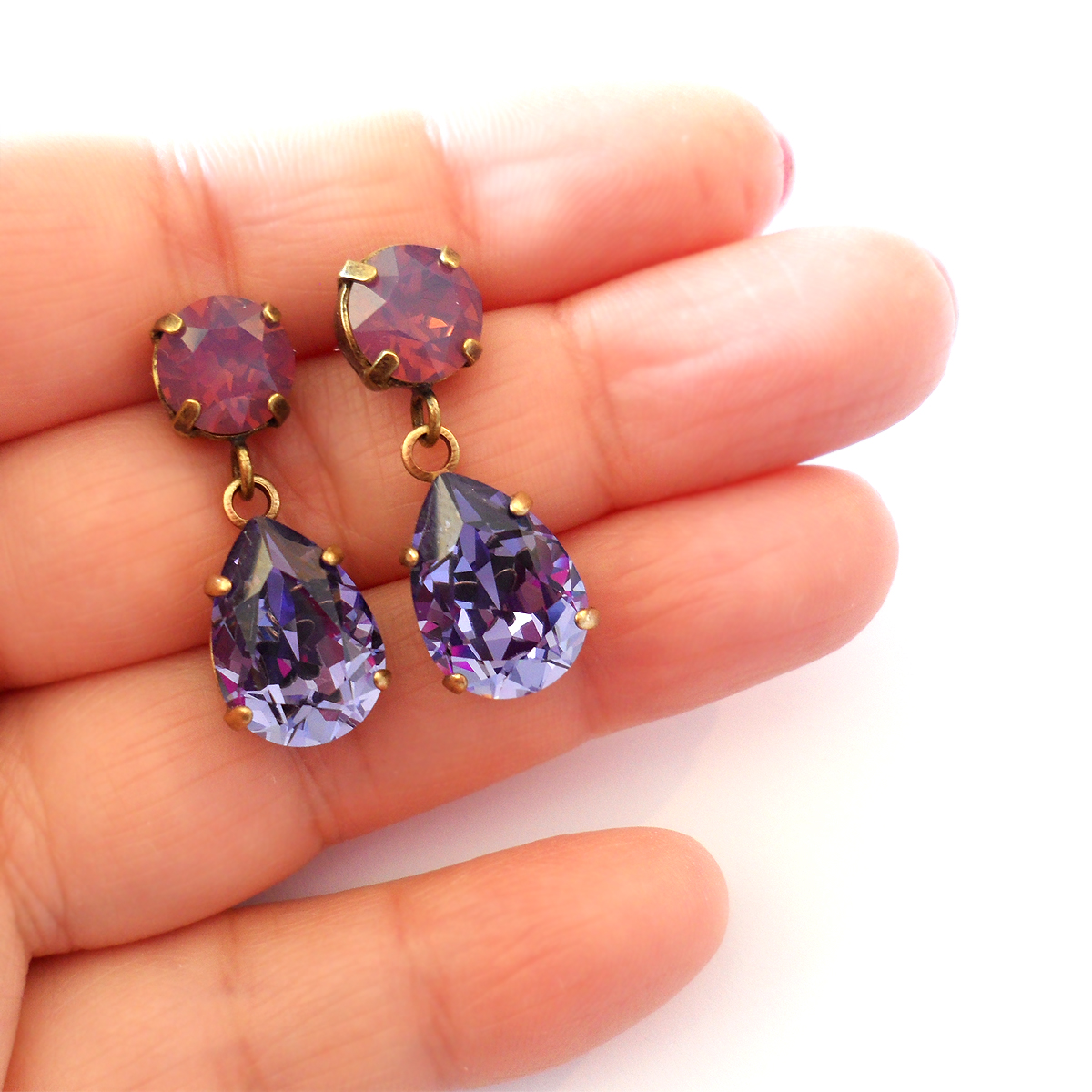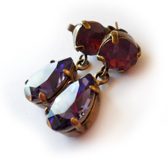 Brilla todos los días con estos preciosos pendientes joya creados con gotas de cristales de Swarovski facetadas en tonos lila y tanzanite y montados en pendientes de bronce .
