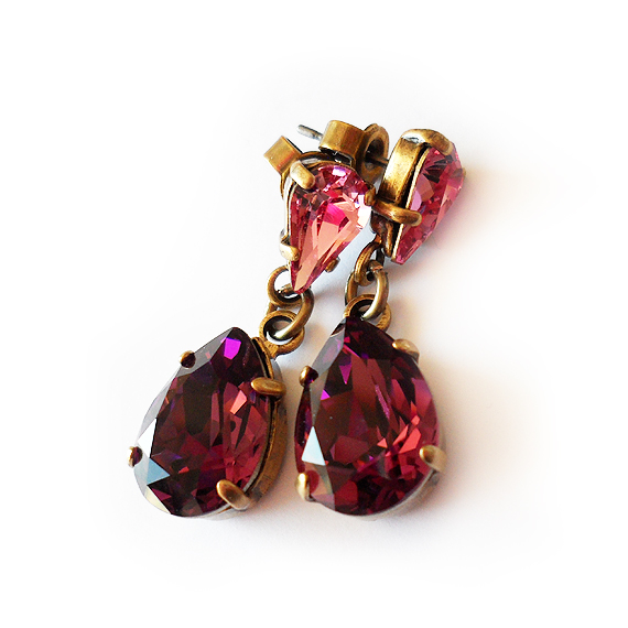 Brilla todos los días con estos preciosos pendientes joya creados con gotas de cristales de Swarovski facetadas en tonos rosa y amatista y montados en pendientes de bronce .