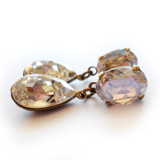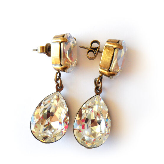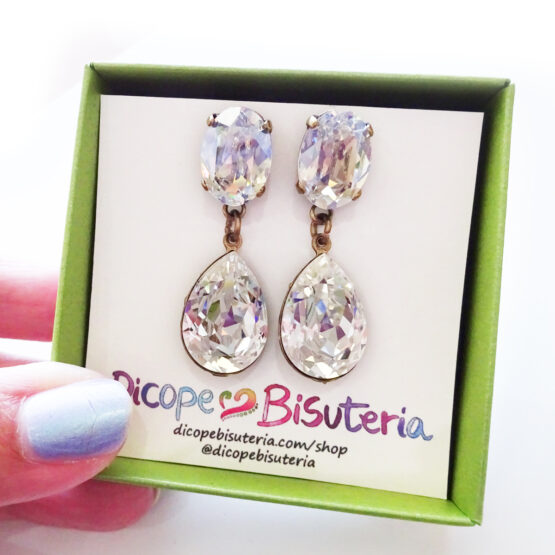 Brilla todos los días con estos espectaculares pendientes joya creados con gotas de cristales de Swarovski facetadas en tonos cristal blanco con hermosos destellos y montados en pendientes de bronce .