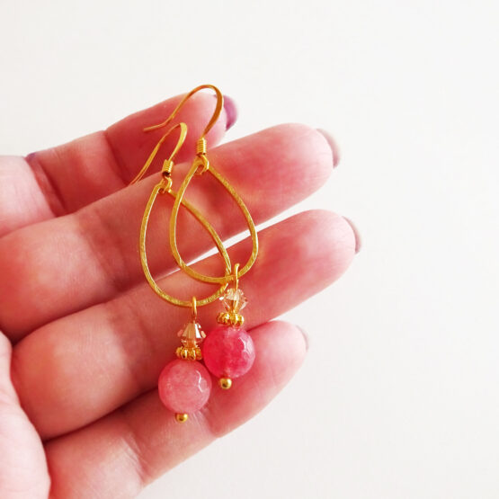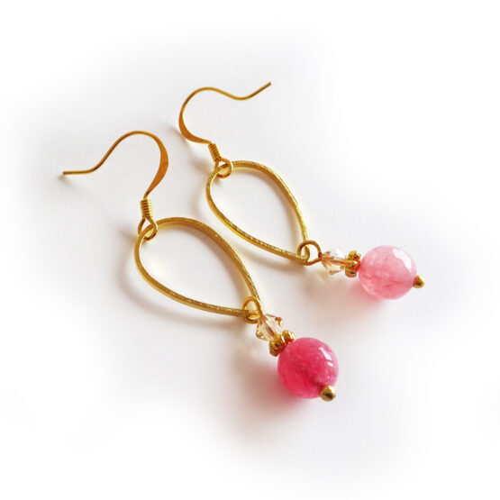 Elegantes pendientes creados con cuentas de piedra de agata en color rosita y cristales de swarovski en color champagne! Estos originales pendientes se pueden mover las lagrimas de metal y ponerlas al reves para tener dos modelos de pendientes en uno ;)