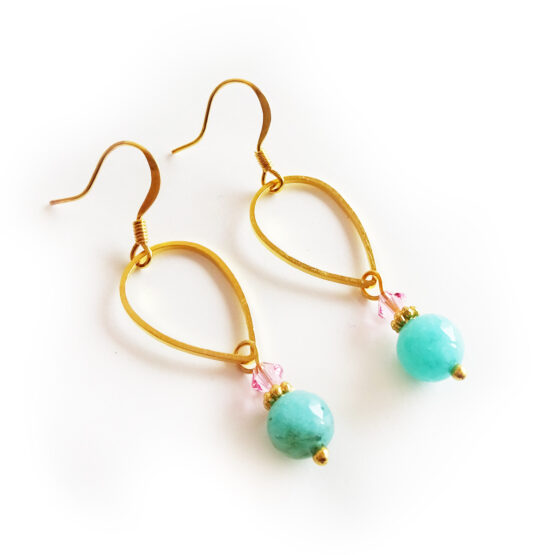 Elegantes pendientes creados con cuentas de piedra de agata en color azul turquesa y cristales de swarovski en color rosita! Estos originales pendientes se pueden mover las lagrimas de metal y ponerlas al reves para tener dos modelos de pendientes en uno ;)