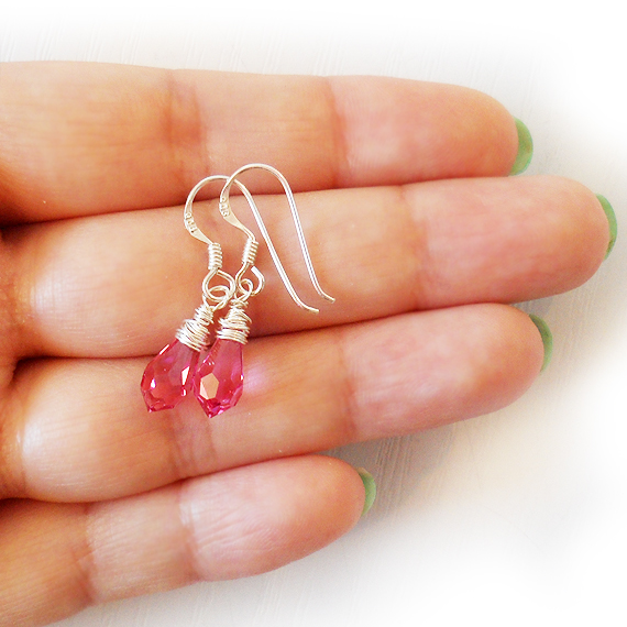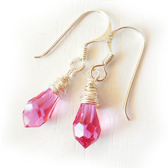 Hermosos y resplandecientes pendientes creados con pequeñas lágrimas facetadas de cristal de Swarovski en tono rosa y montados en pendientes de plata de ley .