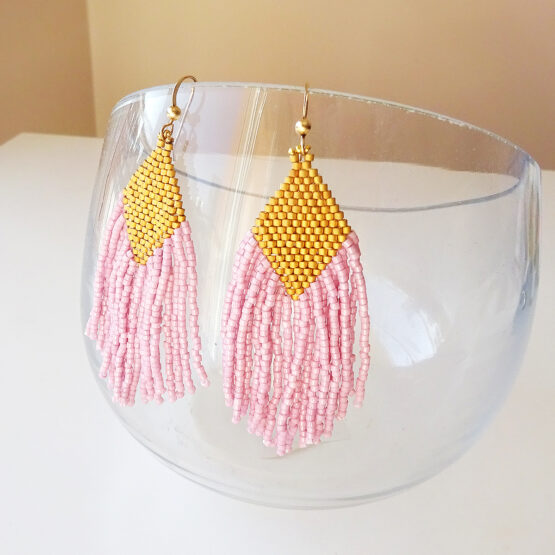 Maravillosos pendientes de Plumitas Boho tejidos con bolitas de miyuki delica de cristal bañadas en oro de 24kt con un acabado mate y bolitas de cristal en tono rosa vintage. Montados en pendientes bañados en oro de 14kt.