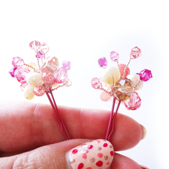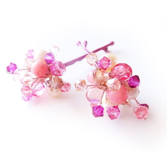 Preciosas pinzas de pelo creadas con de auténtico cristal de swarovski, perlas de rio y cristal de bohemia en tonos rosas y fucsias .