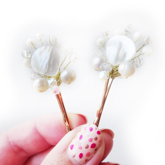 Preciosas horquillas de pelo estan creadas con auténtico cristal de swarovski en tonos blancos, cuentas de nacar y perlas de rio .
