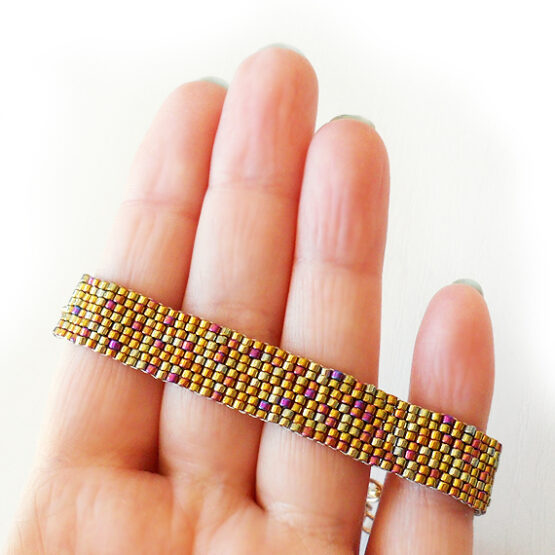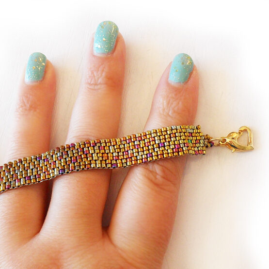 Pulsera Iris creada con mas de 400 bolitas de cristal en color oro viejo brillante montada en una larga cadena dorada . Perfecta para Todas las Medidas !