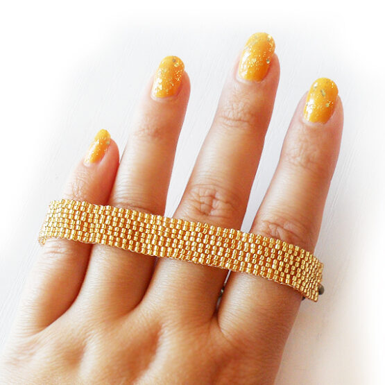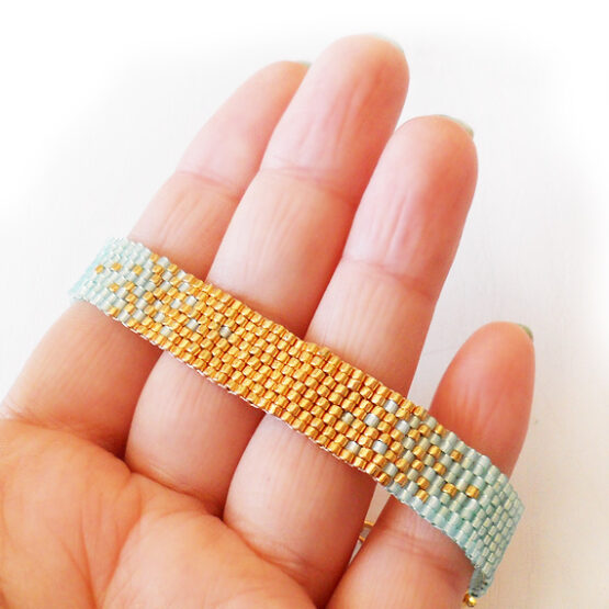 Elegante Pulsera Clara creada con mas de 400 bolitas de cristal en un diseño de degradado en azul mint brillante y dorado montados en una larga cadena dorada . Perfecta para Todas las Medidas !