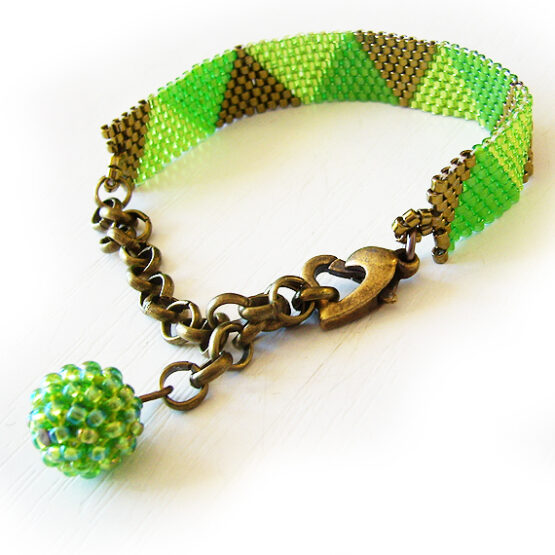 Nueva Pulsera Elisabeth creada con mas de 400 bolitas de cristal en un diseño de triangulos y tonos verdes montados en una larga cadena de bronce . Perfecta para Todas las Medidas !