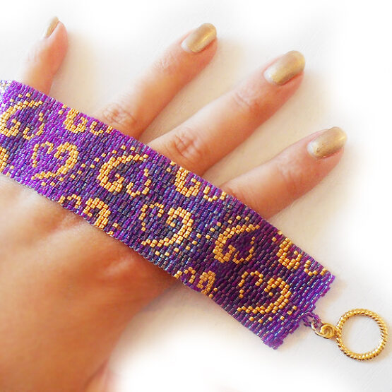 Hermosa y original pulsera ancha creada a mano con mas de 2000 bolitas de cristal de la mejor calidad en colores morado y dorado con un elegante diseño con el logo único de dicopebisuteria en forma de corazón ! Esta preciosa joya para toda la vida se sujeta con un cierre de dorado muy fácil de usar !