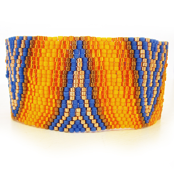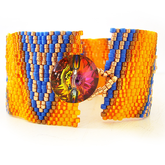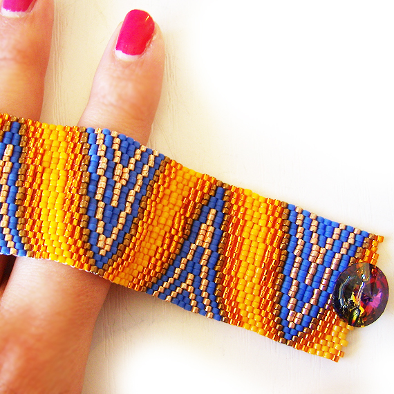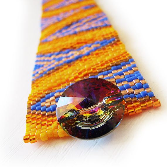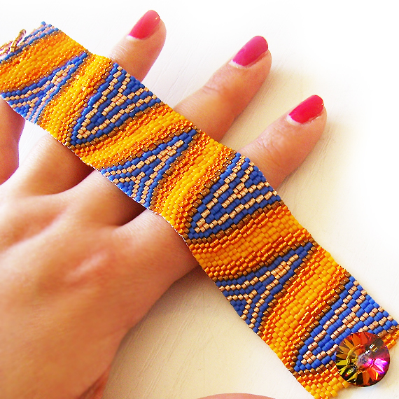 Elegante y original pulsera ancha creada a mano con mas de 2000 abalorios de cristal de la mejor calidad llamados delicas en varios tonos azules , naranjas y bronce . Este hermoso diseño único de dicopebisuteria se inspira en las en el arte óptico ! Se cierra con un precioso boton de cristal de Swarovski muy fácil de usar !