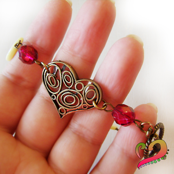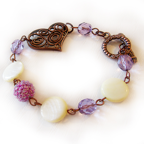 Preciosa y romántica pulsera creada a mano con un charm de corazón y una de mis cuentas hecha añadiendo bolitas alrededor de una bola de madera ! Brillantes abalorios de cristal facetados en lila y cuentas de madre perla en amarillo suave hacen que sea una pieza única que amaras para siempre !